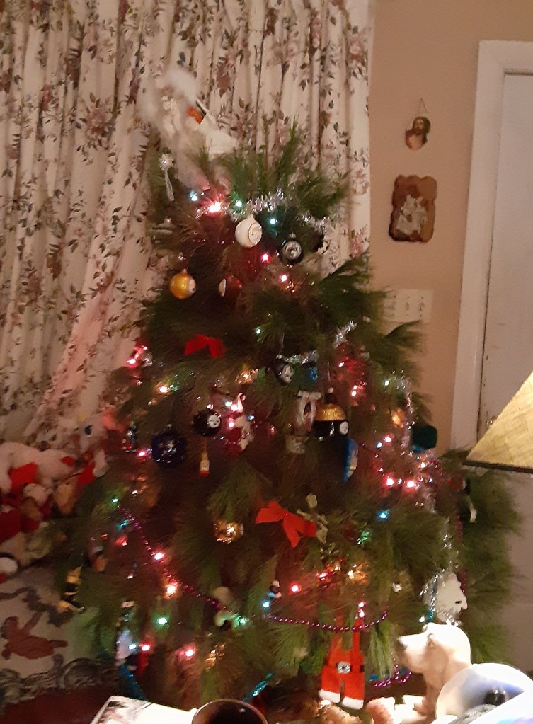 Once again, I screamed for my husband. He came running again. He repositioned the tree and I tightened and loosened the screws several times, but each time he let go, the tree started to fall. After Lou’s hand went numb, we finally got it to stand. The only problem was it was leaning to the left a lot. The angel on top looked like she was going to jump for dear life.