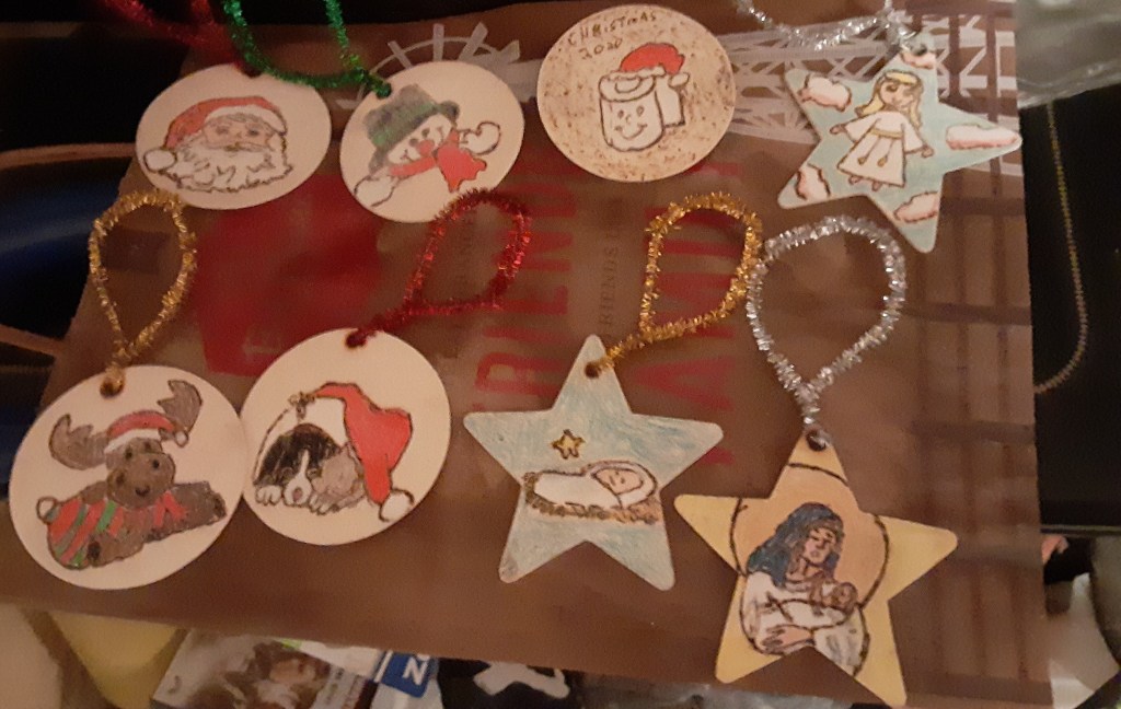 I used a motorized cart to get around Walmart and I found six packs of small round wood. I joined a pyrography group on Facebook and learned that you can find pictures to woodburn on Google public domain clipart. I started searching Christmas pictures. I printed the pictures out and began making Christmas ornaments. I have two pyrography tools so I can use two different tips at a time. I burned pictures of Santa Caus, a reindeer, Mary holding Jesus, a dog and cat under a Santa hat, snowmen, and an angel. Instead of feeling helpless, fighting racing thoughts and drowning in depression, I was concentrating on my projects. I had to trace the clipart on the wood and concentrate on burning the design into the wood. I had no time for those unwanted thoughts or to dwell in my sadness.