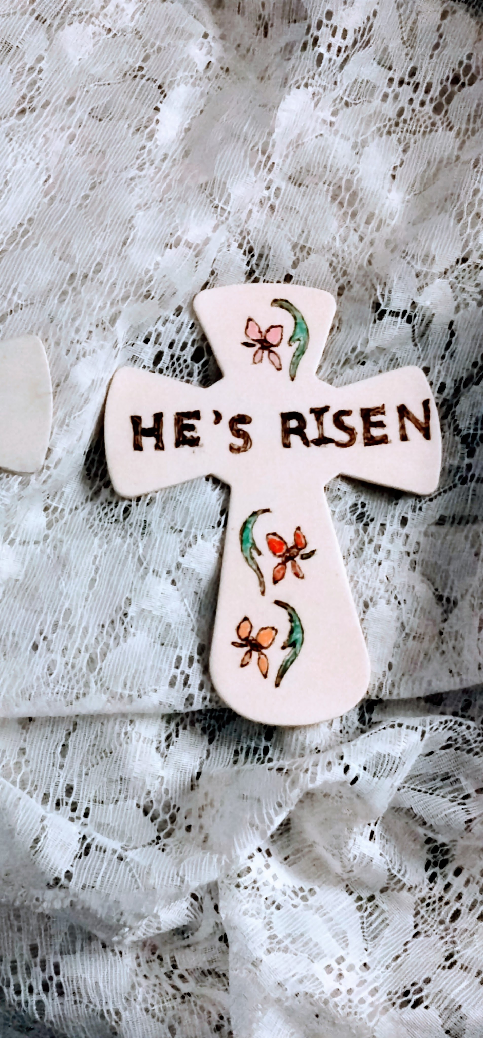 For the crosses I use stencils to put the words “He’s Risen” across the middle of the cross and stencils to decorate the top and bottom half of the crosses. Woodburning relieves my stress and keeps my mind occupied. I get excited when a customer requests something special. My mind starts thinking of what patterns I can use to fill the request. It feels like I have reached a euphoria. I flip through my patterns, I pick the patterns I need, I make copies on my printer, I cut them and position them, and I tape them and carbon paper to the wood. Finally, I trace them to the wood and then I burn them. All of this takes concentration which keeps the worries away.