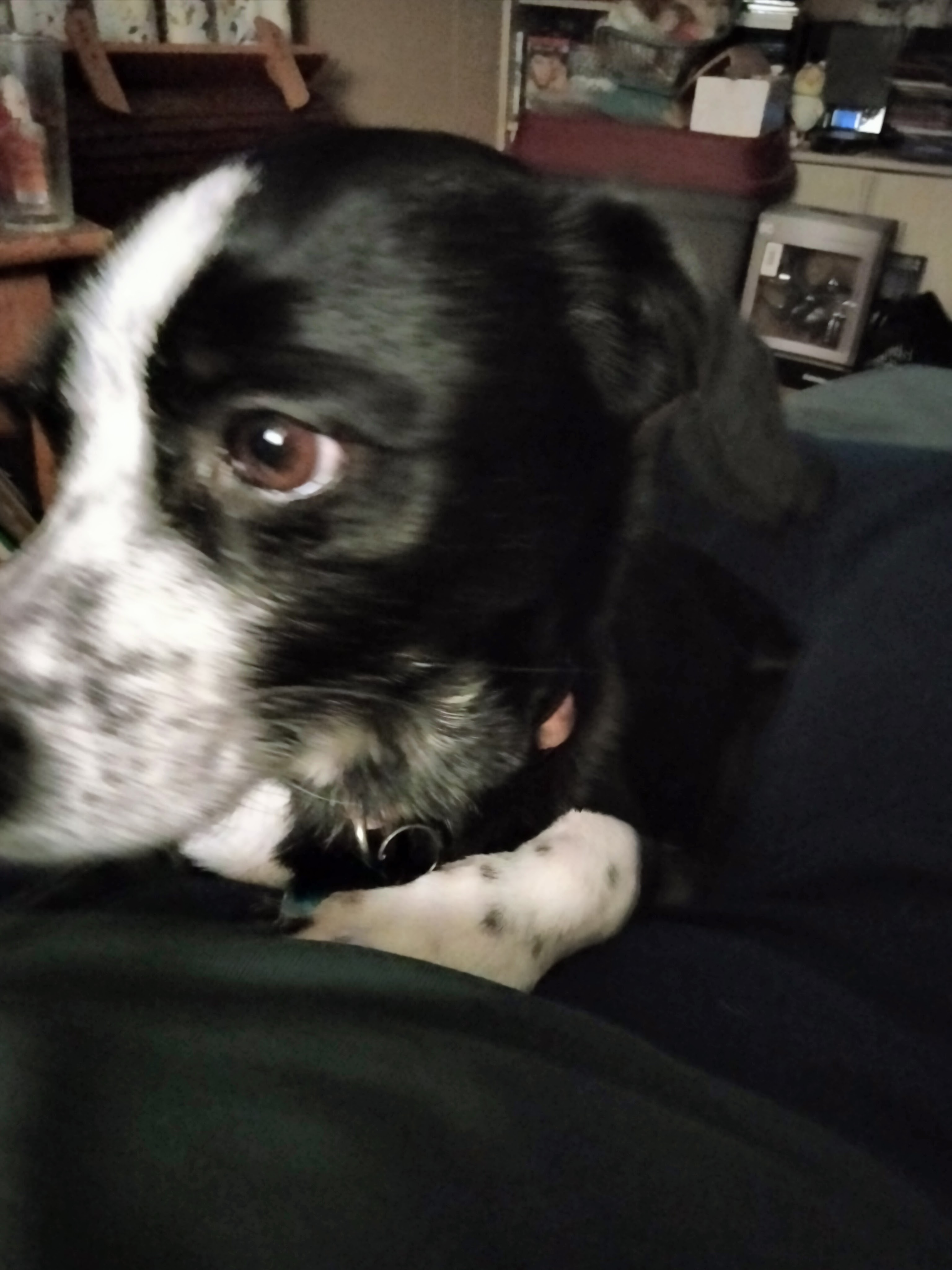 One day Lou and I went to our great niece’s birthday party and when we came home, we saw blood in her crate. It was a Sunday, and no vets were open, so I called the emergency vet. They said to make sure I got her into my vet the next day, but my vet was booked. I called all over Erie until I found a vet that would take her. The vet examined her, got a urine sample, and took a sonogram. They showed us the sonogram image. Our baby girl had a stone in her bladder the size of an egg. She’s only a thirteen-pound dog. They gave us medication and told us of a prescription food to help break down the stone.